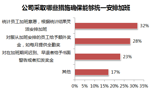 企业为了能够保证加班顺利进行,32%的企业采取统计员工加班意愿,根据统计结果灵活安排加班;28%的企业对服从加班安排的员工给予额外奖金;23%的企业对在加班期间迟到、早退者给予书面警告或者扣发奖金。