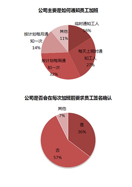 调研结果显示,16%的企业会临时通知员工加班,27%的企业每天上班时通知员工加班,32%的企业每周通知一次,14%的企业每月通知一次员工加班事情。其中36%的企业在员工加班前要求员工签名确认。