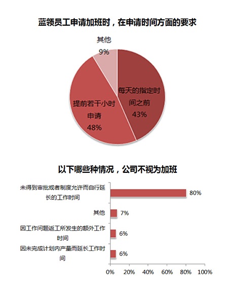 除公司统一安排加班外,员工在申请加班时,43%的企业要求员工必须在指定时间之前提交申请,48%的企业要求员工必须提前若干小时递交申请。