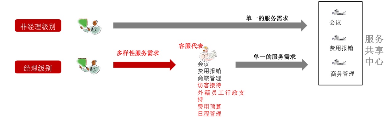 (2)客服代表将会负责处理多样性的服务需求,包括:日程安排管理、重要访客接待、外籍专家行政事务支持、大型活动统筹等等。单一性的服务需求经客服代表分类后,交由服务共享中心跟进。