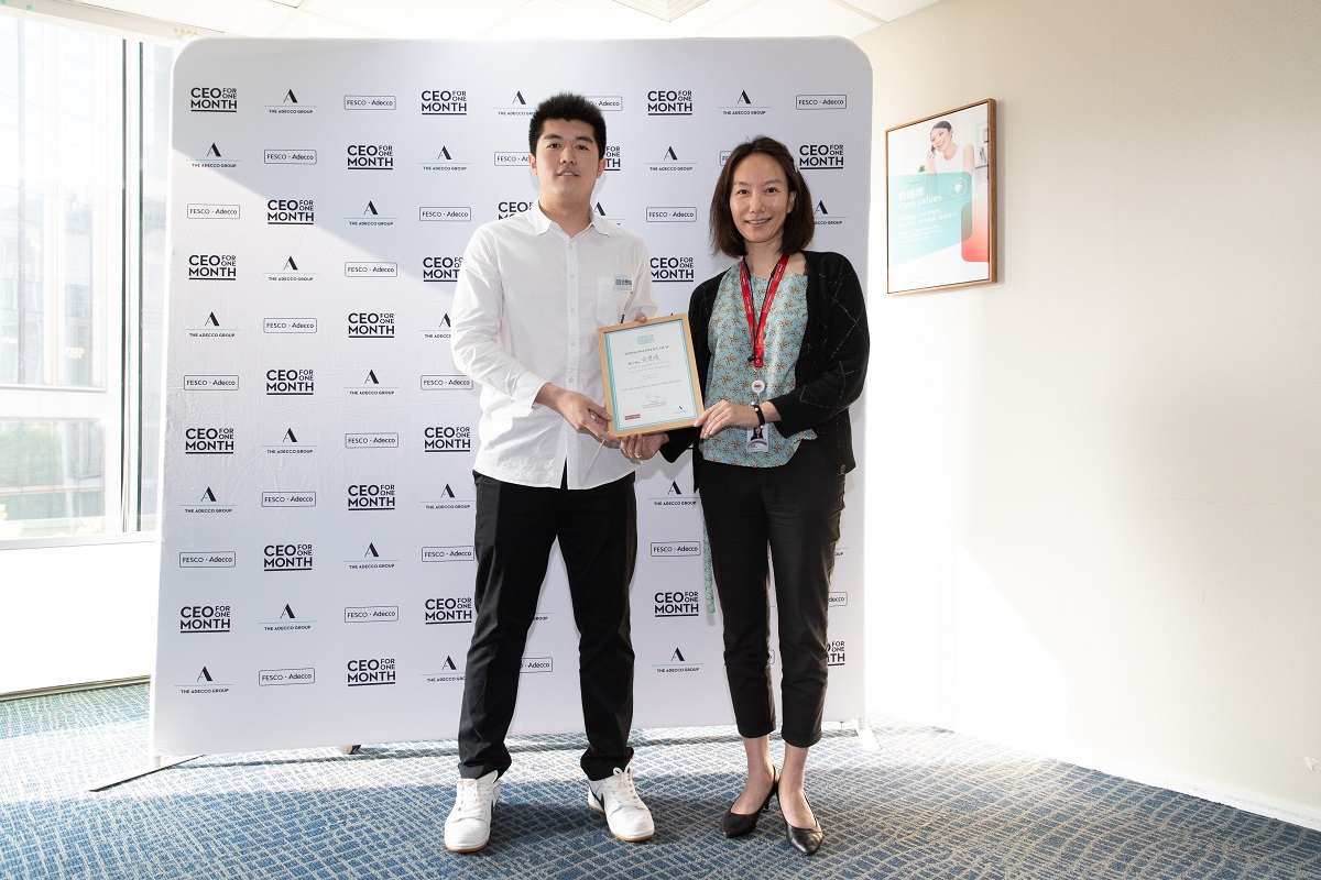 △ 外企德科上海总经理宋菲菲女士为 “CEO for One Month 2021”中国区优胜者徐赟祺颁发获奖证书